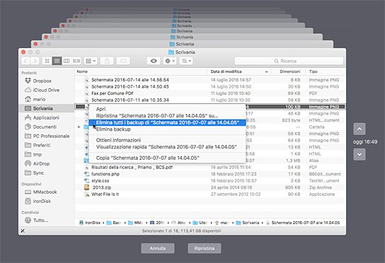 Time Machine è la soluzione di backup incrementale integrata nel sistema operativo macOS (per ora ancora OS X). L’utilizzo è semplicissimo: quando si collega per la prima volta un disco esterno è lo stesso sistema operative che ci chiede se vogliamo utilizzarlo per conservare una copia di sicurezza dei dati. Basta acconsentire e ogni ora Time Machine copierà i file modificati negli ultimi sessanta minuti, mantenendo ogni singola versione.