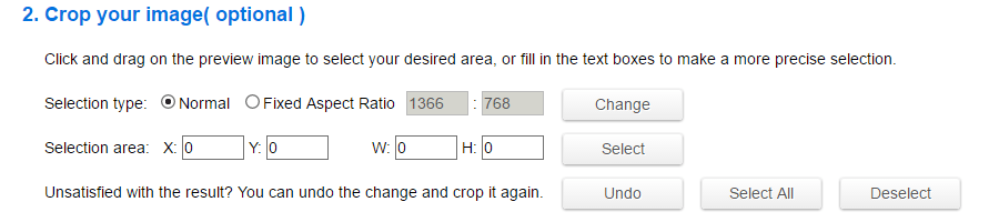Il primo – e ovvio – passaggio è quello di selezionare e caricare online l’immagine (purtroppo non è supportato il trascinamento diretto dell’immagine). I punti 2 e 3 sono opzionali e vi consentono di ritagliare parte dell’immagine (sia in con un fattore di forma libero che con un ben preciso aspect ratio, per esempio 16:9 o 3:2) oppure impostare direttamente la dimensione del crop in pixel (utile se volete catturare un semplice dettaglio). Una volta ritagliata l’immagine è possibile ruotarla.