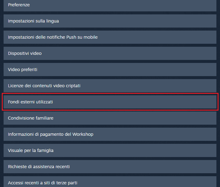 Per accedere ai dati in oggetto è possibile seguire due strade differenti. La prima prevede l’uso del client di Steam, l’accesso a al Menu Guida (in alto a sinistra), Assistenza di Steam, quindi Il mio account, Dati associati al tuo account di Steam e infine Fondi esterni utilizzati.