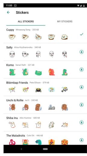 Per aggiungere pacchetti di adesivi alla propria libreria basterà toccare il ”+” a destra e si aprirà una pagina esplicativa dei vari pacchetti disponibili al momento e anche di quelli già scaricati. Per scaricare il pacchetto desiderato basterà toccare l’icona a freccia presente nella parte destra dello schermo.