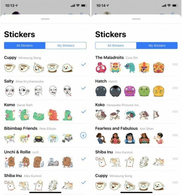 Dopo aver selenzionato il “+” si aprirà una pagina dove sarà possibile effettuare il download del pacchetto di adesivi desiderato. La spunta blu segnala se il pacchetto è stato scaricato con successo oppure no. A questo punto è possibile fare swipe down per vedere gli adesivi. Di nuovo, per inviarlo ai propri amici basterà toccarlo.
