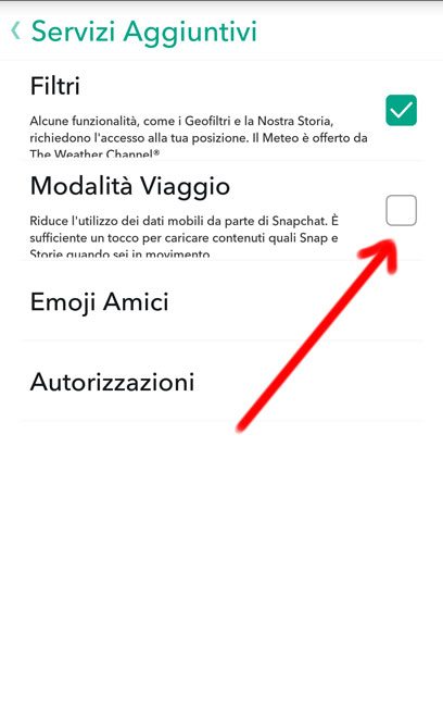 La modalità viaggio è stata introdotta per evitare un consumo eccessivo del traffico dati. Una volta impostata non scarica immediatamente snap e storie, ma permette all’utente di decidere quando effettuare il download. Per attivarla è sufficiente fare tap sull’icona del fantasma in alto al centro dello schermo, poi selezionare l’icona a forma di ingranaggio in alto a destra. Una volta all’interno della schermata delle Impostazioni si deve far scorrere lo schermo verso il basso fino a raggiungere la voce Servizi Aggiuntivi. Facendo tap su Gestisci si potrà abilitare la Modalità Viaggio.