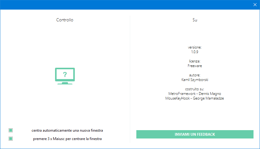 La prima opzione, centra automaticamente una nuova finestra, riporta al centro dello schermo qualsiasi nuova finestra aperta dopo il caricamento in memoria di WCH. La seconda, premere 3 x Maiusc per centrare la finestra, permette com’è ovvio di centrare una finestra non ancora centrata con la combinazione da tastiera descritta.
