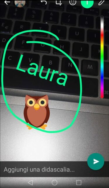 Dopo aver scattato una foto o filmato, o prima di condividere un contenuto già presente sullo smartphone, è possibile aggiungere un tocco personale accedendo ai nuovi tool che ora appaiono in Whatsapp nella parte in alto a destra dello schermo. Selezionando lo smile si può scegliere fra una serie di emoticon predefinite, mentre per aggiungere del testo è sufficiente fare tap sulla lettera T posizionata sempre in alto a destra. Il testo inserito può essere scalato, ruotato e colorato grazie alla palette presente sul lato destro dello schermo. Per inserire graffiti e disegni a mano libera, è sufficiente scegliere il simbolo della matita.