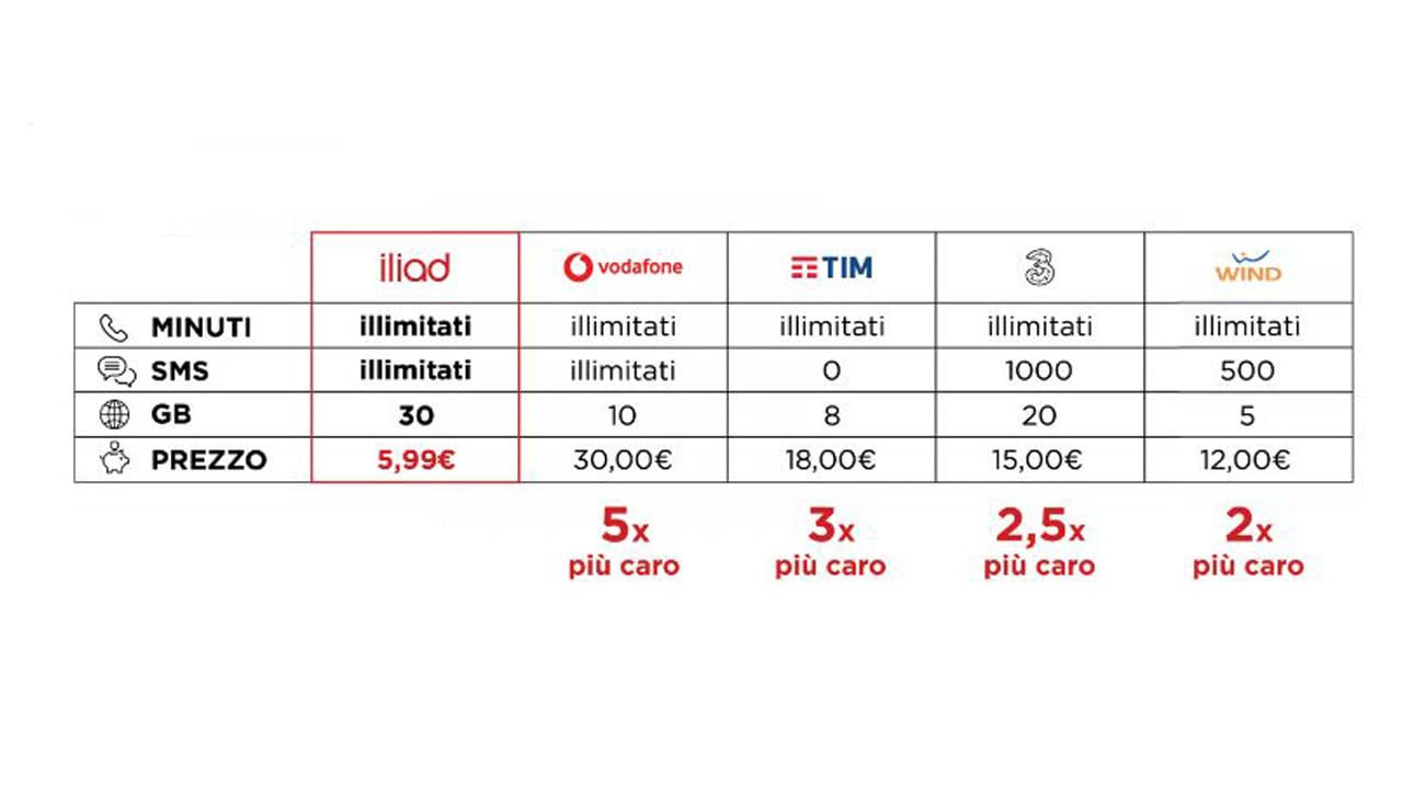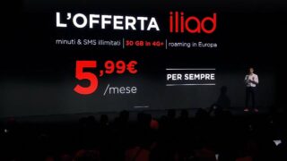 Anzi, l’unica offerta. Infatti Iliad propone ai nuovi clienti minuti illimitati, Sms illimitati, 30 GB mensili di traffico in 4G+ al prezzo aggressivo di 5,99 euro al mese, per sempre. Non solo: il roaming in Europa prevede 2 GB in più di traffico, in Europa il roaming prevede solo 2 GB di traffico, mentre i minuti illimitati prevedono chiamate verso fissi e mobili in Italia, Europa (solo numeri fissi) e in 65 paesi al mondo. Per l’attivazione e la consegna della Sim l’azienda richiede il costo una tantum di 9,99 euro (comprese le spese di spedizione), tutto senza vincoli.