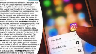 Sono in molti i VIP che hanno postato su Instagram un’immagine di testo, sostenendo che il social stia cambiando la propria privacy riguardo le foto. In questa porzione scritta l’utente sostiene di non dare il permesso a Instagam di rubare i propri data come foto, messaggi e informazioni sia passate che future. Tuttavia si tratta di una bufala che ha iniziato a girare su Instagram proprio perché diffusa da personalità influenti del web.