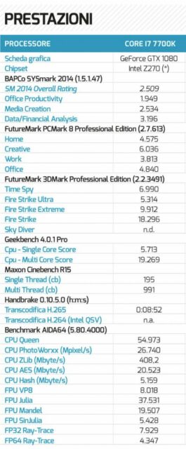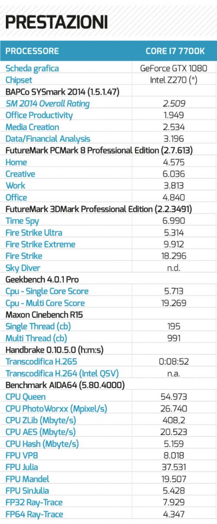 Nella tabella che vi proponiamo in questa anteprima potete leggere i risultati che abbiamo rilevato durante la prova del processore Intel Core i7 7700K, mentre nella tabella completa presente sul numero di PC Professionale trovate anche quelli relativi ai processori Intel Core i7 6700K e Intel Core i7 4790K. Le prove sono state eseguite sia con una scheda grafica discreta (una GeForce GTX 1080) sia sfruttando il comparto grafico integrato nel processore.