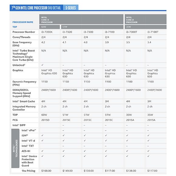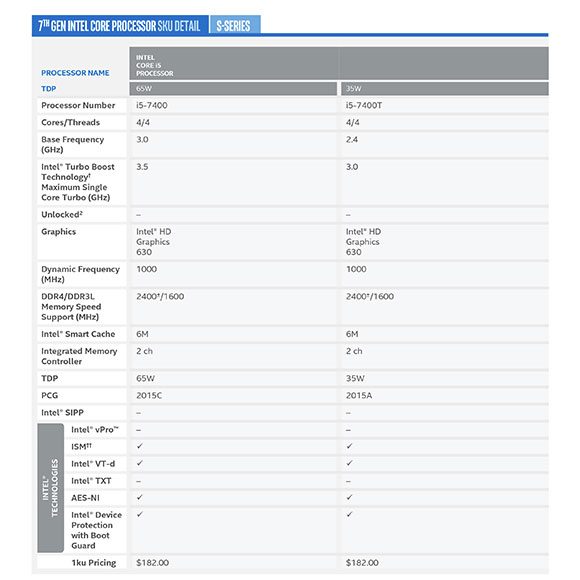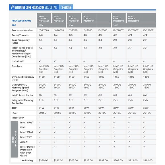 Così come è già avvenuto con Broadwell e Skylake, anche l’architettura Kaby Lake è disponibile in quattro versioni, ciascuna identificata da un suffisso specifico: Kaby Lake-Y, Kaby Lake-U, Kaby Lake-H e Kaby Lake-S. I processori basati su Kaby Lake-Y sono caratterizzati da un Tdp (Thermal Power Design) di 4,5 watt e sono indirizzati a sistemi 2-in-1 e Compute Stick. I modello basati su Kaby Lake-U sono caratterizzati da un Tdp di 15 watt e sono indirizzati ai computer ultra sottili, ai sistemi 2-in-1, ai convertibili e ai mini Pc. I processori basati su Kaby Lake-H hanno un Tdp pari a 45 watt e sono pensati per i notebook di fascia alta e per le workstation portatili (a listino Intel propone due Xeon di classe mobile). Infine, i processori basati sulla Kaby Lake-S – oggetto di questo articolo – sono pensati per i sistemi desktop e sono disponibili in diverse versioni con Tdp di 35, 65 e 91 watt in funzione della versione e della frequenza operativa.