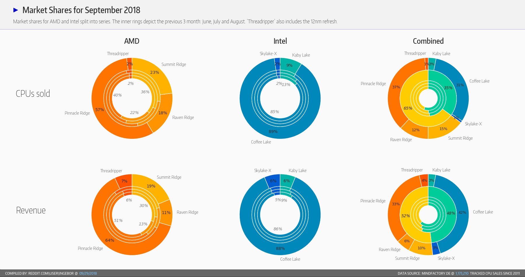 Stando ai dati forniti dal negozio tedesco Mindfactory.de, la slavina AMD avrebbe in realtà già cominciato a intaccare il business x86 di Chipzilla: a settembre 2018, il numero di processori venduti da AMD ha superato quelli di Intel con un 65% contro il 35%. La differenza nei ricavi è invece molto più contenuta (52% contro 48%) grazie ai costi crescenti delle sempre meno disponibili CPU Core di Santa Clara.