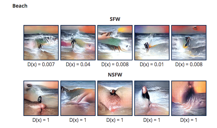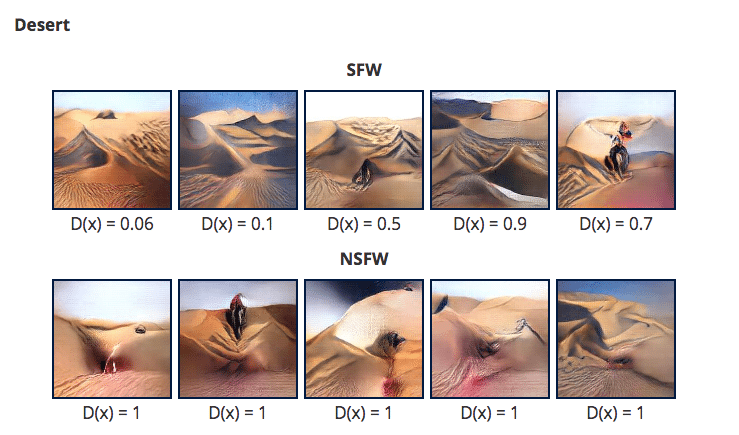 L’esperimento mostra risultati interessanti quando la rete neurale arriva a creare immagini NSFW basate su scenari già elaborati dall’AI del MIT: in effetti, paesaggi con spiagge, concerti o canyon, vengono identificati come materiali potenzialmente NSFW, a causa delle sagome riprodotte e soprattutto dei colori, giacché vengono scambiate per organi genitali umani.