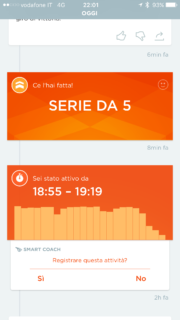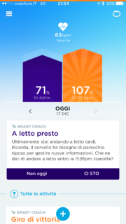 L’app di Jawbone per valutare i risultati della nostra attività fisica è disponibile per iOS, Android e Windows Phone (opzione interessante perché sono pochi gli activity tracker che hanno l’app per il sistema operativo di Microsoft). L’app è molto bella e completa. La sincronizzazione con il bracciale è quasi immediata appena si avvia. L’app registra ogni momento della nostra attività quotidiana. Tutti i report sono visualizzati in un diario con una serie di grafici e prospetti statistici che rendono evidente la nostra tendenza. Una parte importante dell’esperienza d’uso dell’UP3 è demandata allenatore intelligente digitale, chiamato Smart Coach. Lo Smart Coach non solo è un motivatore che ci avverte e ci sprona nei periodi troppo tranquilli, ma analizzando i dati statistici registrati dal bracciale ci fornisce consigli su come raggiungere o migliorare i nostri obbiettivi. Si può registrare anche ciò che si mangia per avere un bilancio complessivo della calorie giornaliere. Devo dire che pur essendo una funzione interessante non l’ho mai usata a fondo perché totalmente manuale: devi ricordarti di farlo e non sempre ciò che mangi è nel database del software. Quindi non mi sento di dare un giudizio su questa funzione.