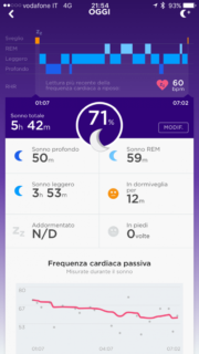 Buona la rilevazione del sonno, grazie anche alla misura del battito cardiaco a risposo. Ottima anche la sveglia silenziosa (smart alarm), che ci sveglia con una vibrazione in una finestra temporale da noi impostata e valutata dal prodotto in base a come stiamo riposando (si imposta ora della sveglia e finestra dello Smart Alarm).