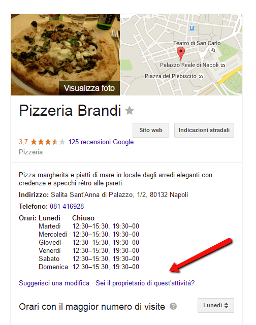 E guarda caso la scheda della Pizzeria Brandi non è verificata come si può vedere dallo screenshot: appare il link “Sei il proprietario di questa attività ?” che indica la mancata rivendicazione di quella scheda.