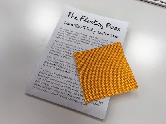 La cartina dell’evento e un frammento del tessuto con il quale gli artisti hanno deciso di rivestire l’opera The Floating Piers.
