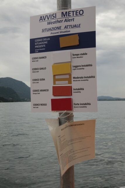 Nei punti di accesso ai tratti galleggianti della passeggiata su The Floating Piers sono presenti i cartelli con gli avvisi meteo.