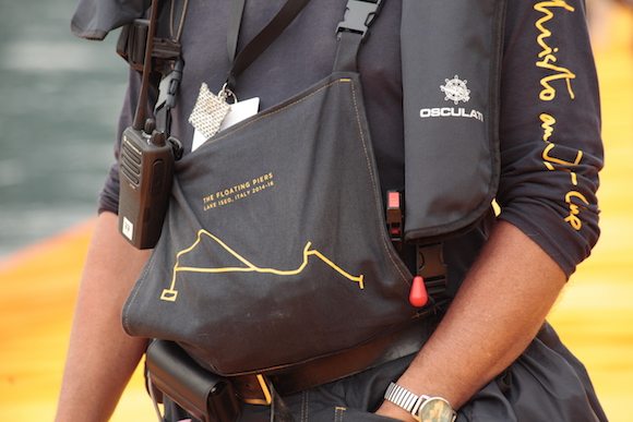 Gli addetti all’opera The Floating Piers vestono una divisa con salopette in jeans che riporta il disegno dell’opera.