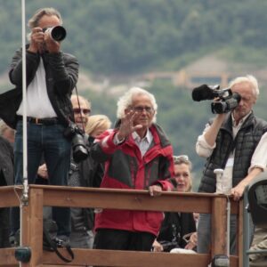 Christo saluta i visitatori mentre a bordo di un battello costeggia l’intera opera durante il secondo giorno di apertura.