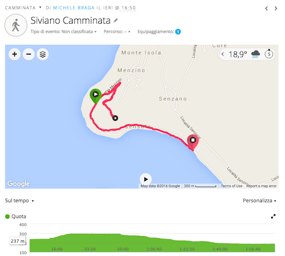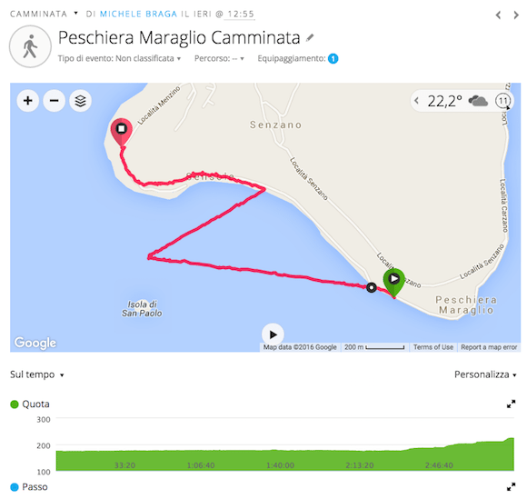 Uno spezzone del tragitto rilevato con il Gps durante la camminata che da Peschiera Maraglio porta verso l’isola di San Paolo e poi verso Sensole (e in questo caso non è un errore del Gps)