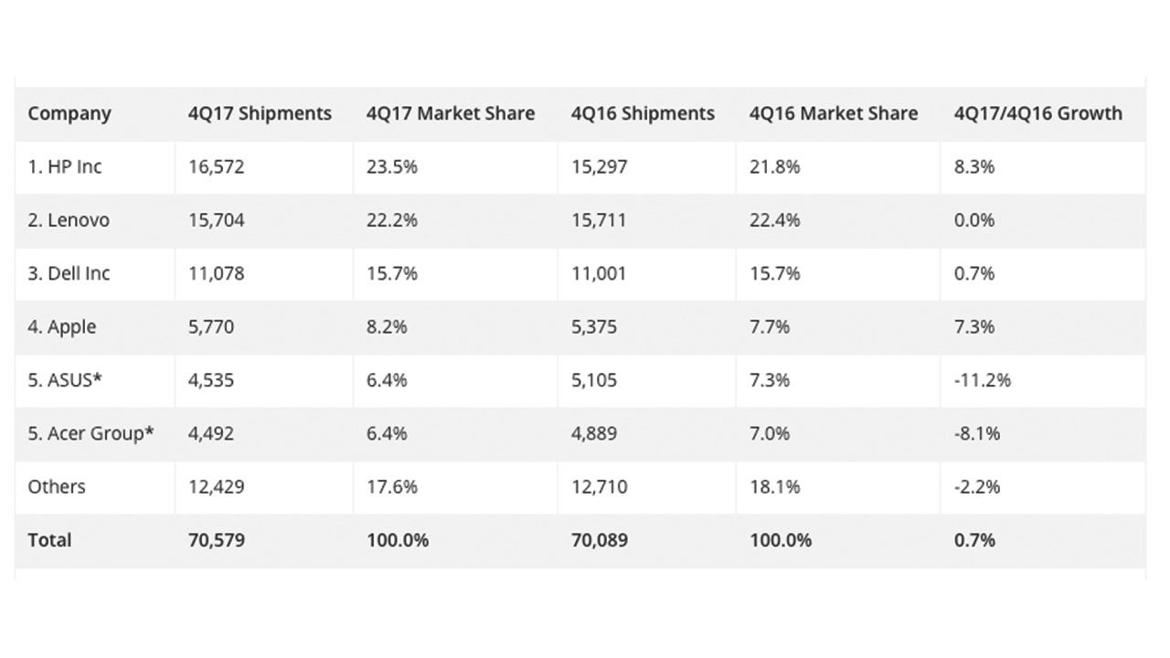 Analizzando i dati relativi all’ultimo trimestre 2017, risulta determinante per la ripresa il boom di HP, che si conferma leader del settore con oltre 16 milioni di unità vendute (23,5% della quota di mercato), e una crescita dell’8,3% rispetto ai dati del quarto trimestre 2016.