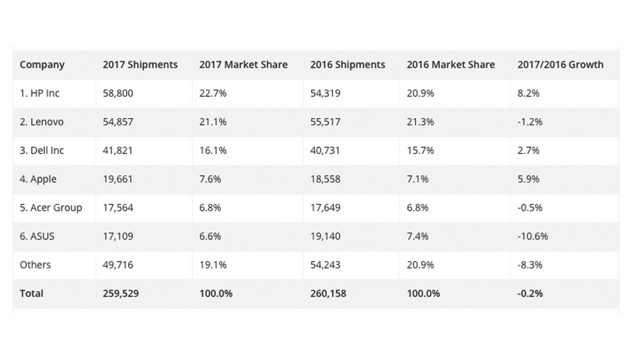IDC attesta un calo dello 0,2% delle vendite di PC nel 2017, risultato tuttavia ampiamente migliore rispetto al -1,5% del 2016. Dati in migliaia di unità. (Fonte IDC)