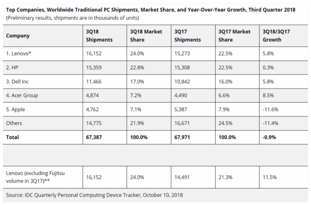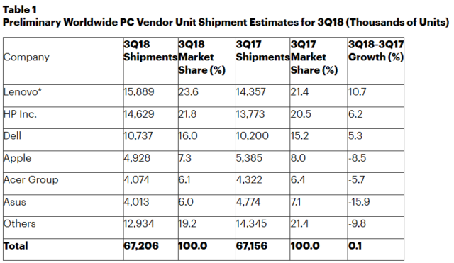 Le stime più ottimistiche sul numero dei PC commercializzati (arrivati cioè nei negozi ma non direttamente nelle case dei consumatori finali) durante il terzo trimestre del 2018 le ha fornite Gartner, calcolando un aumento del +0,1% rispetto allo stesso periodo dell’anno scorso. Il ciclo di rinnovo del parco macchine dovuto a Windows 10 ha fatto bene al settore, soprattutto in ambito enterprise.