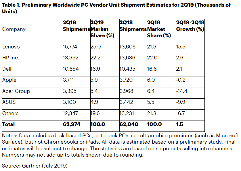 Mercato PC Q2 2019 - Gartner