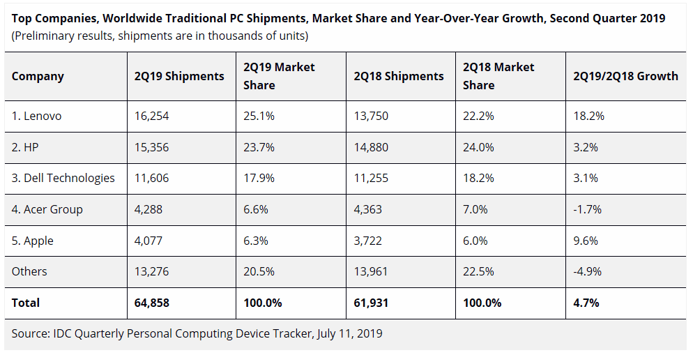 Mercato PC Q2 2019 - IDC