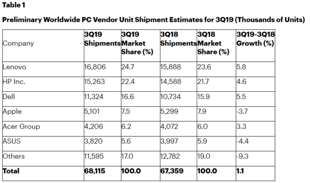 Secondo le stime preliminari fornite in questi giorni di Gartner, negli ultimi tre mesi il numero di PC commercializzati è cresciuto del +1,1% rispetto allo stesso periodo dell’anno scorso fino a superare i 68 milioni di sistemi. Crescono le spedizioni di tutti e tre i principali produttori di settore (Lenovo, HP e Dell), mentre fa peggio Apple (quarta nella classifica dei produttori mondiali) con un -3,7%.
