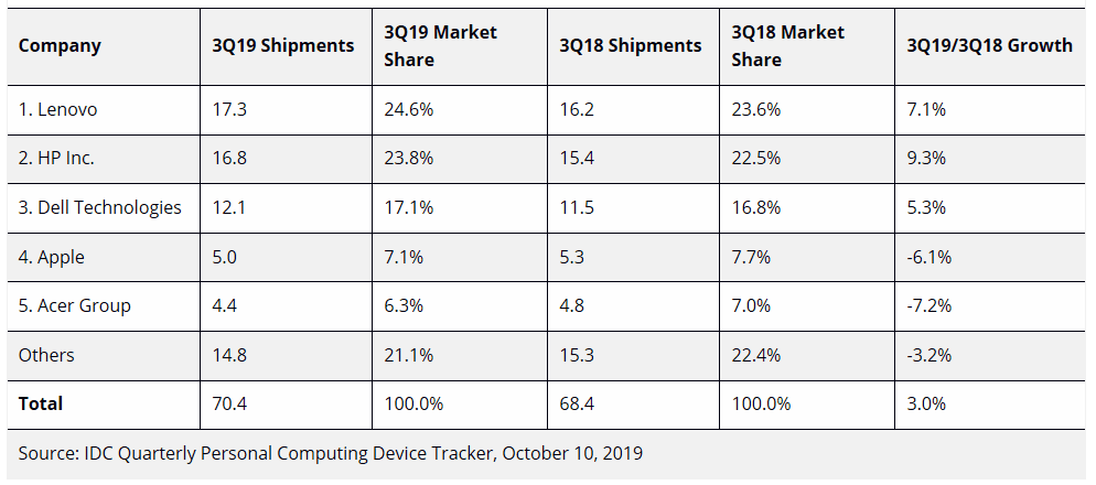 Anche le stime preliminari sul terzo trimestre fornite da IDC sono positive, e superano quelle di Gartner fotografando un mercato che cresce del +3% fino a 70 milioni di sistemi commercializzati. Diversamente da Gertner, però, IDC include anche i Chromebook nella definizione di PC “tradizionali” ed esclude (come già Gartner) i tablet x86.