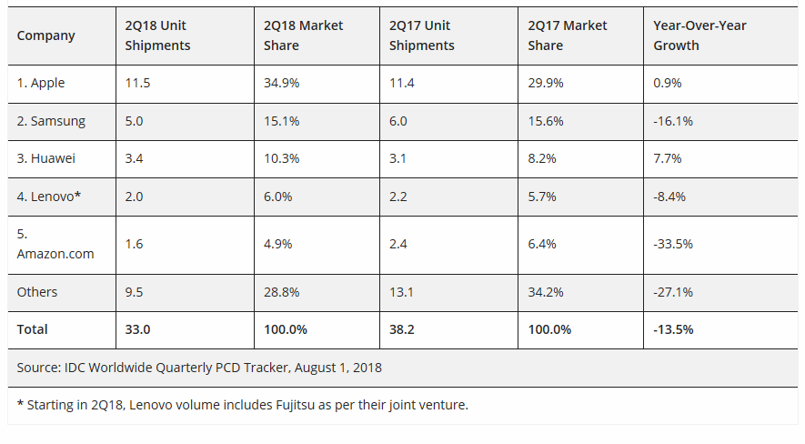 Le stime di IDC riferite al secondo trimestre del 2018 parlano di 33 milioni di tablet commercializzati, con un -13.5% rispetto allo stesso periodo dell’anno scorso; si tratta del quindicesimo trimestre in calo, dicono ancora gli analisti, e dal declino a singola cifra del 2017 si è ora passati a quello a doppia cifra nei primi due trimestri del 2018.