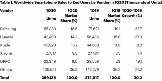 La pandemia COVID-19 ha colpito tutti i settori. Le fabbriche sono rimaste chiuse e gli utenti hanno deciso di acquistare solo prodotti essenziali (considerando anche i ritardi nelle consegne). Il crollo del mercato degli smartphone è piuttosto pesante. Rispetto al primo trimestre 2019 sono stati venduti oltre 75 milioni di unità in meno con un calo del 20,2%.