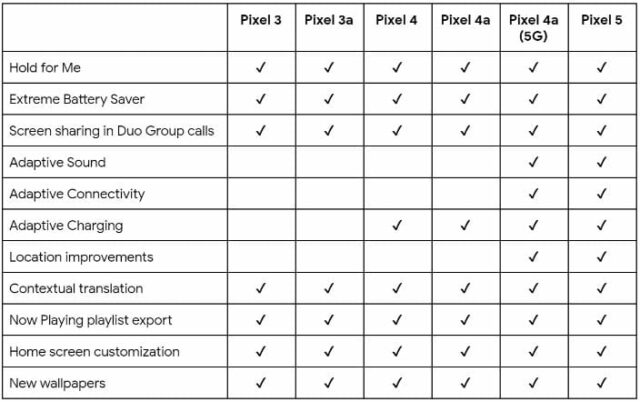 Altre novità sono relative alla personalizzazione della schermata home, al miglioramento del GPS e al riconoscimento dei brani musicali con Now Playing. La tabella elenca tutte le funzionalità e i Pixel supportati.