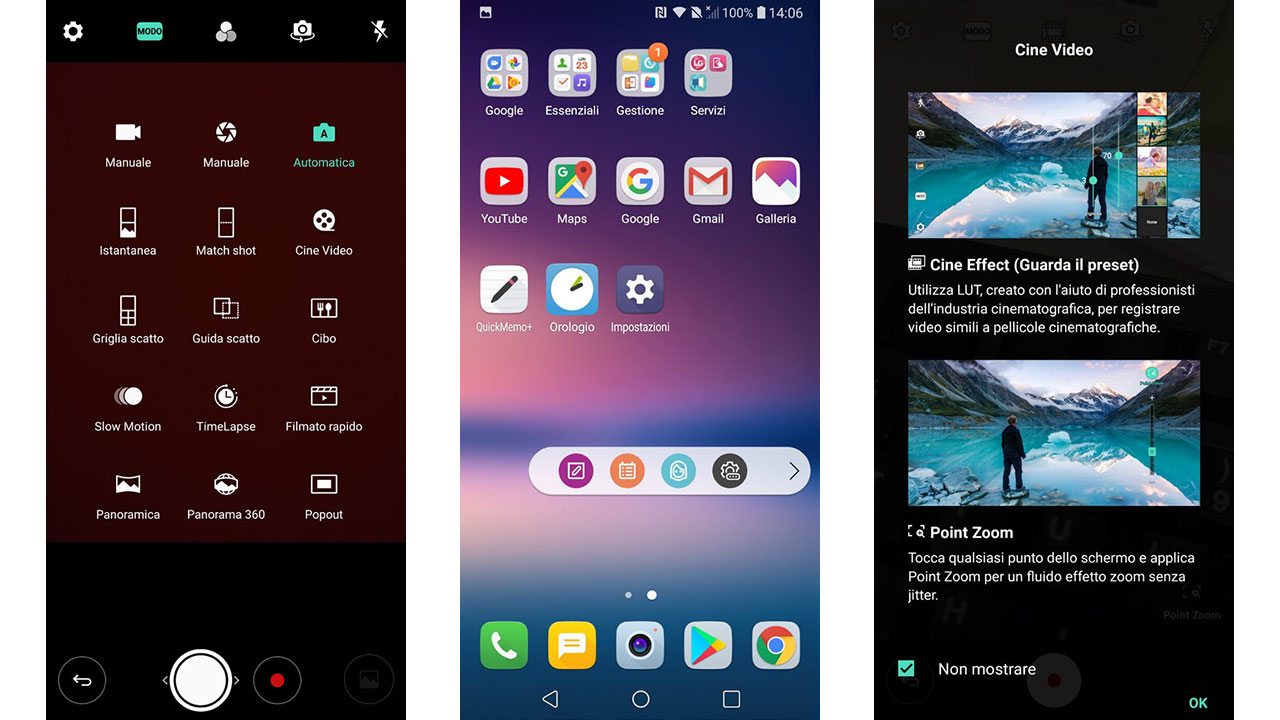 Da sinistra, le modalità della fotocamera; l’interfaccia LG UX 6 con la barra mobile per le operazioni rapide; il pannello Cine Video per aggiungere effetti in tempo reale ai propri filmati.