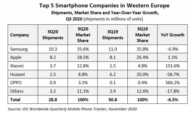 Il mercato degli smartphone in Europa Occidentale è stato seriamente colpito dalla pandemia COVID-19. I lockdown attuati in molti paesi hanno portato alla chiusura dei negozi di elettronica, quindi i consumatori non hanno avuto la possibilità di vedere i nuovi modelli. Nel terzo trimestre 2020 sono stati consegnati 28,8 milioni di unità con una diminuzione del 6,5% rispetto allo stesso periodo del 2019.