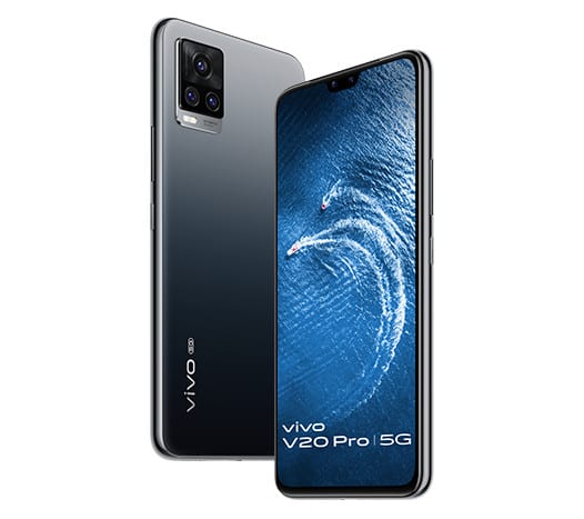 Il Vivo V20 Pro possiede una cover in vetro opaco con rivestimento antigraffio e uno schermo AMOLED da 6,44 pollici con risoluzione full HD+ (2400×1080 pixel). Al centro della parte superiore che un notch che ospita due fotocamere frontali con sensori da 44 e 8 megapixel (standard con eye autofocus e ultra grandangolare).