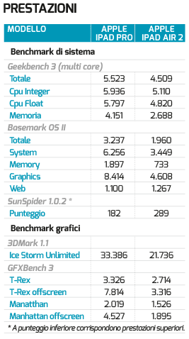 La velocità operativa dell’iPad Pro è veramente molto alta. La reattività è visibilmente maggiore rispetto a quella, già buona, dell’iPad Air 2. La cosa si nota in ogni frangente, dalla semplice apertura e chiusura delle app fino all’utilizzo di giochi 3D molto complessi. Tanta potenza e un display così grande in effetti aprono la strada a una nuova generazione di app, che possono essere ben più complete e complesse di quelle attuali. Autocad, Photoshop, iMovie con supporto all’editing video 4K sono solo alcuni dei titoli ottimizzati, in grado di funzionare in maniera completa e di sfruttare tutto l’hardware messo a disposizione.