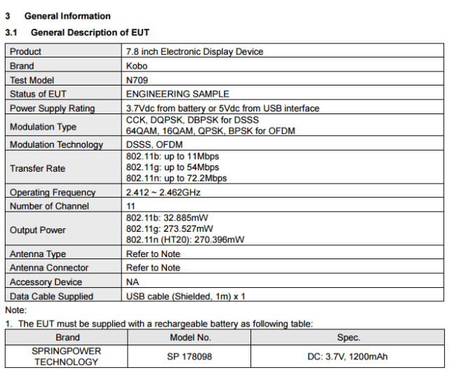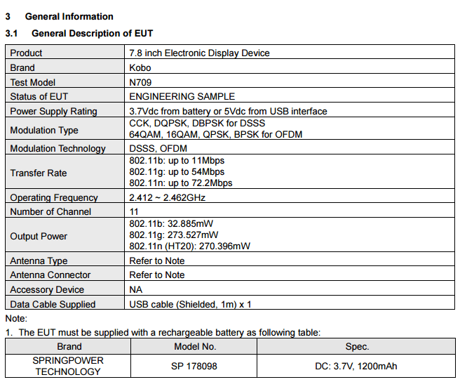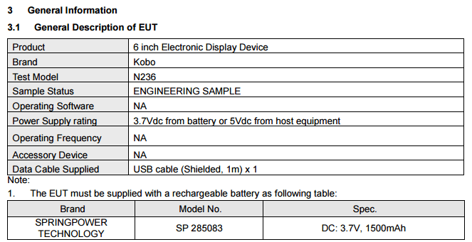 In più, però, scorrendo i datasheet si scopre sia il nome del prodotto (Kobo Aura One, sempre che questo rimanga il nome commerciale) che i dettagli sulla dimensione dello schermo e sulla capacità della batteria. L’N326 è un “tradizionale” 6 pollici con batteria da 1.500 mAh, mentre l’N709 è senza dubbio una novità molto interessante, visto che integrerebbe un innovativo 7,8 pollici (e batteria da 1.200 mAh). Si tratta di un modello che andrebbe finalmente a rompere gli schemi, proponendo le dimensioni di un tablet (in pratica avrebbe la stessa dimensione del display dell’iPad mini, da 7,9 pollici) in un ebook reader.