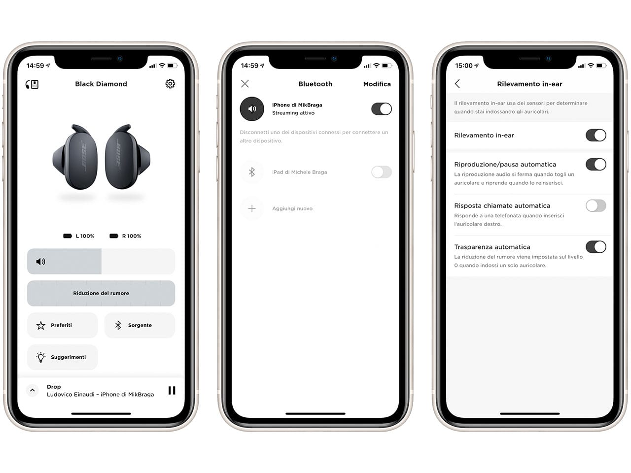 In questo campo l’accoppiata iPhone e AirPods Pro vince ancora su tutte le altre soluzioni del mercato grazie al chip proprietario che permette connessioni davvero stabili. Il limite forse più fastidioso degli auricolari Bose riguarda la connessione a più dispositivi: per passare dallo smartphone al tablet, ad esempio, è necessario prima disconnettere i QuietComfort da un dispositivo per poterlo attivare sull’altro.