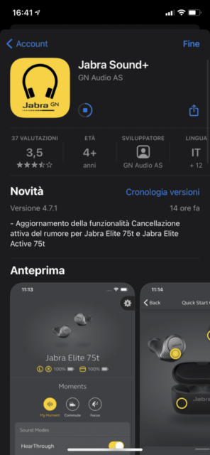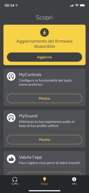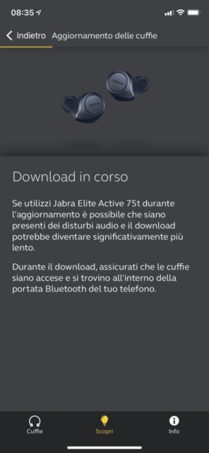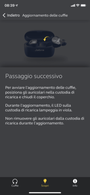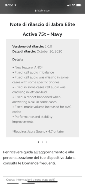 L’installazione del nuovo firmware 2.0.0 con l’aggiunta della tecnologia ANC è molto semplice. Basta avviare l’app Jabra Sound+ con gli auricolari già configurati con lo smartphone. Non appena gli auricolari si attivano una volta indossati, l’app mostra la disponibilità del firmware. Seguendo le indicazioni sullo schermo dello smartphone bastano pochi minuti per completare l’aggiornamento.