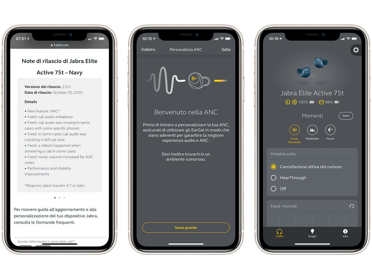 Tutte le funzioni avanzate dei dispositivi Jabra sono controllate dall’app Sound+ disponibile sia sull’App Store di Apple sia sul Play Store di Google. Una volta collegati gli auricolari attraverso il pannello di controllo Bluetooth del vostro smartphone, potete utilizzare l’app per configurare i parametri di equalizzazione – su cinque bande – che possono essere associati a tre diverse modalità d’uso: predefinito (musica), pendolare (viaggio) e focus (ufficio).