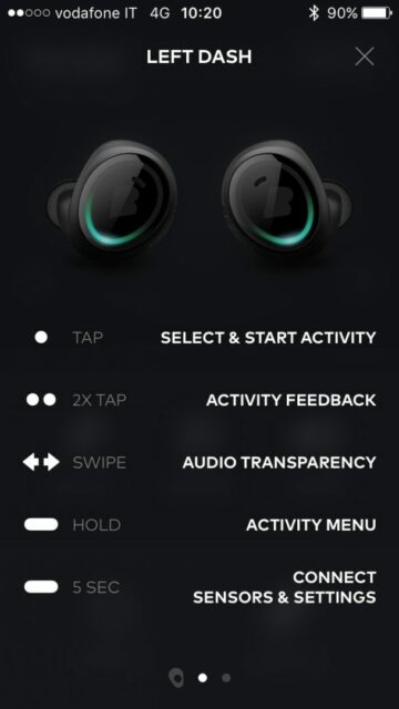 I The Dash sono affiancati da un’app – disponibile per dispositivi iOS, Android e Windows 10 mobile – ma il sistema di controllo passa attraverso un sistema di gesture e tocchi sugli auricolari stessi. Entrambi gli auricolari sono infatti forniti di una superficie sensibile al tocco. Grazie a un singolo tap è possibile avviare o mettere in pausa la riproduzione di musica (sull’auricolare destro) o con due tap su quello sinistro avviare la registrazione dei dati relativi all’attività fisica. Lo swipe permette di controllare il volume e la funzione Transparency. Mantenendo il tocco sull’auricolare si attiva la modalità di peering Bluetooth.