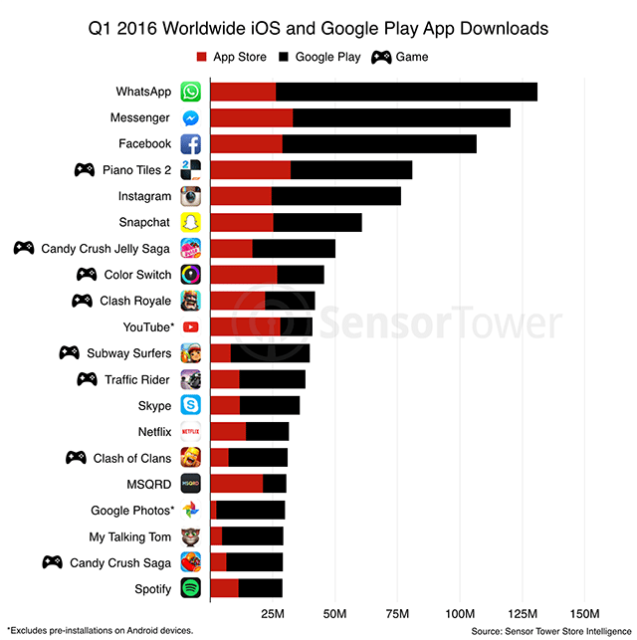 Un report di Sensor Tower relativo alle app nel primo trimestre del 2016 evidenzia che ci sarebbero stati 17,2 miliardi di download di applicazioni da iTunes App Store e Google Play. La crescita relativa al 2015 sarebbe dell’8,2%.