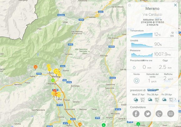 Verrano quindi mostrate le Weather Station attive e cliccando su di essa si potrà osservare la situazione meteo attuale. I dati comprendono temperatura, umidità e pressione barometrica; se sono installati anche i moduli pluviometro e anemometro, si potrà capire anche il livello delle precipitazioni e la velocità del vento.