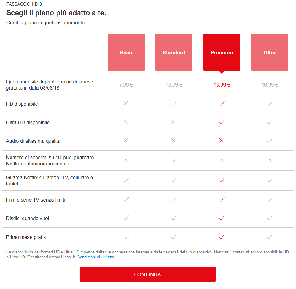 Al momento, i mercati per cui è confermata la disponibilità dell’offerta Ultra di Netflix sono quello italiano e tedesco: avviando la procedura per la registrazione sul servizio, gli utenti di queste due nazioni potranno quindi scegliere tra un piano Base (€8), Standard (€11), Premium (€14) e Ultra (€17).