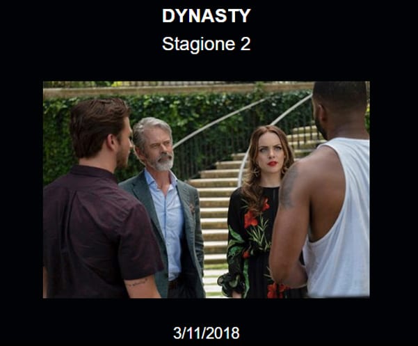 News Netflix catalogo Novembre 2018: tutti i film e le serie tv in uscita Valentina Cestari | 1 Novembre 2018 Serie tv episodi settimanali Serie tv episodi settimanali Dynasty < Indietro Successivo >