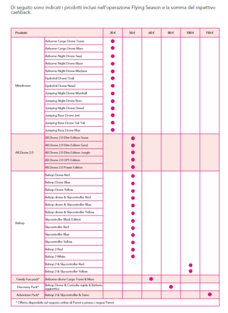 Ma quanto si risparmia? In questo caso Parrot diversifica non solo in base al tipo di prodotto, ma anche in base al “negozio”. Alcuni pacchetti, infatti, sono disponibili solo se si acquista sullo store online di Parrot. In fondo trovate una tabella con tutti i prodotti Parrot che partecipano a questa promozione e al rimborso che potrete ottenere. Oltre allo store online Parrot, i punti vendita sicuramente aderenti sono quelli – sia store fisici che online – delle catene Bennet, Carrefour, Euronics, GameStop, Comet, Mediaworld e Unieuro. Abbiamo sottolineato sicuramente perché l’offerta potrebbe essere usufruibile anche acquistando da altri punti vendita. Abbiamo chiesto maggiori informazioni direttamente a Parrot e aggiorneremo la pagina non appena avremo maggiori informazioni.