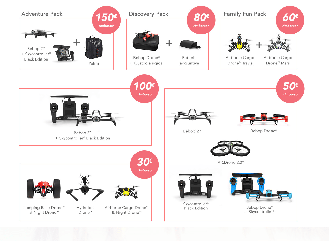 Il tipo di promozione attivato da Parrot è del tipo “cashback“: lo sconto non vi viene effettuato al momento dell’acquisto dal venditore, ma avrete successivamente un rimborso da Parrot, direttamente sul vostro conto corrente. Per la procedura di rimborso vi rimandiamo, per maggiori informazioni, sulla pagina dedicata.