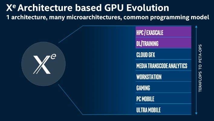 Ponte Vecchio segnerà il debutto di Xe, architettura di GPU in grado di tradursi in diverse declinazioni (grazie a Foveros e alle interconnessioni ad altissima velocità tra i diversi chiplet) proponibili alla clientela in ambito HPC, cloud, trascodifica multimediale, workstating, gaming su PC e sistemi mobile/ultramobile.