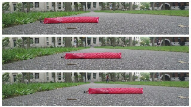 Questo robot si muove grazie all’aria che viene pompata al suo interno (tramite dei tubi o un’unità di controllo installata su di esso): il flusso fa allungare la pelle dell’automa, che si aggrappa poi al terreno e si spinge avanti, proprio come fosse un vero serpente. (Foto di Ahmad Rafsanjani/Harvard University)