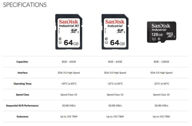 Le nuove SD vengono garantite per un utilizzo tra i -40°C e i +85°C, offendo un range termico di 125°. La serie Industrial, inoltre, offre prestazioni e capacità persino raddoppiate rispetto la precedente generazione, con performance che si attestano su 80 MB/s in lettura e 50 MB/s in scrittura.